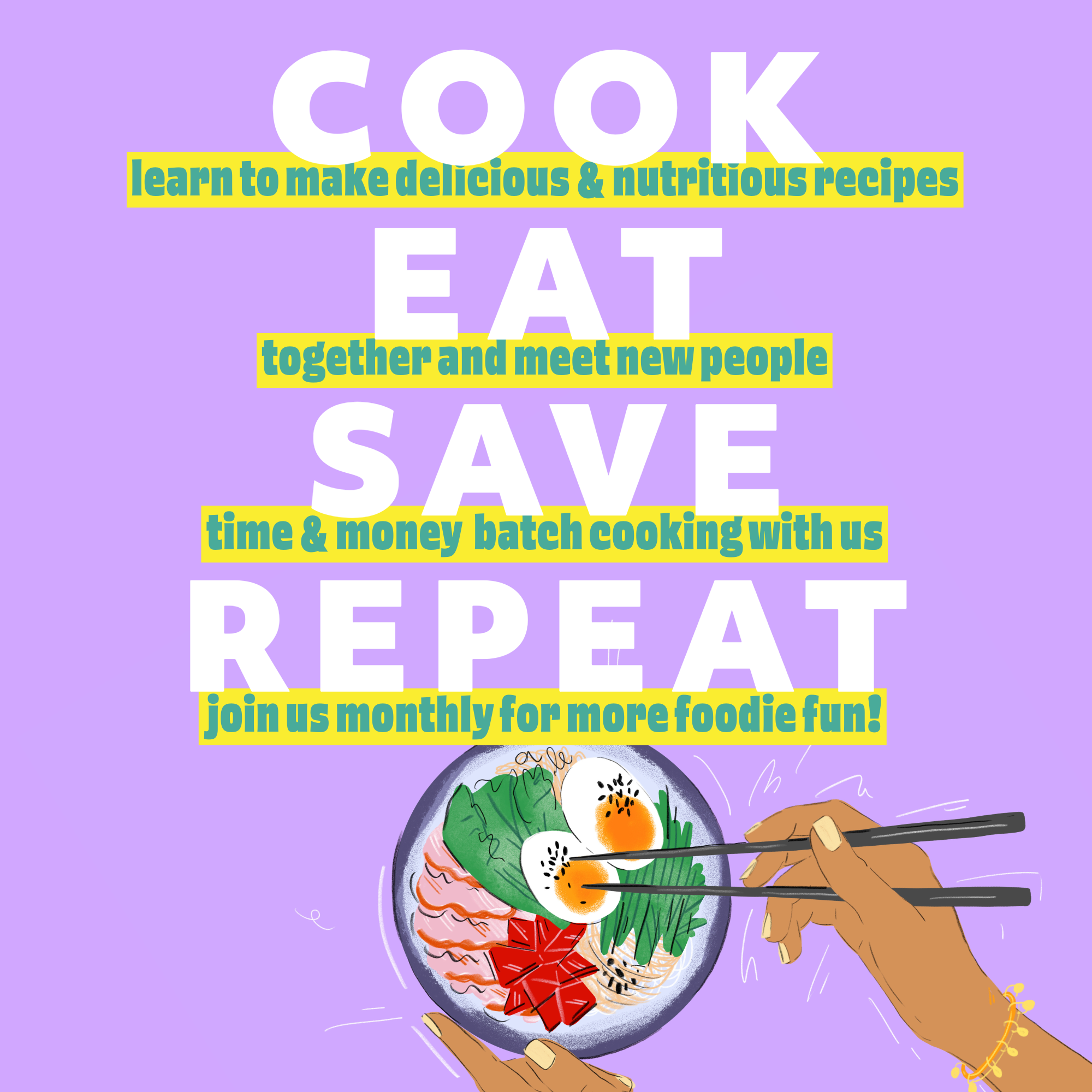 Join our fun monthly cook-ups to learn new recipes and eat delicious food - without emptying your pockets!